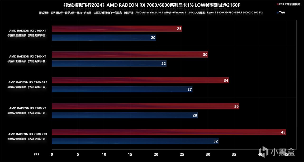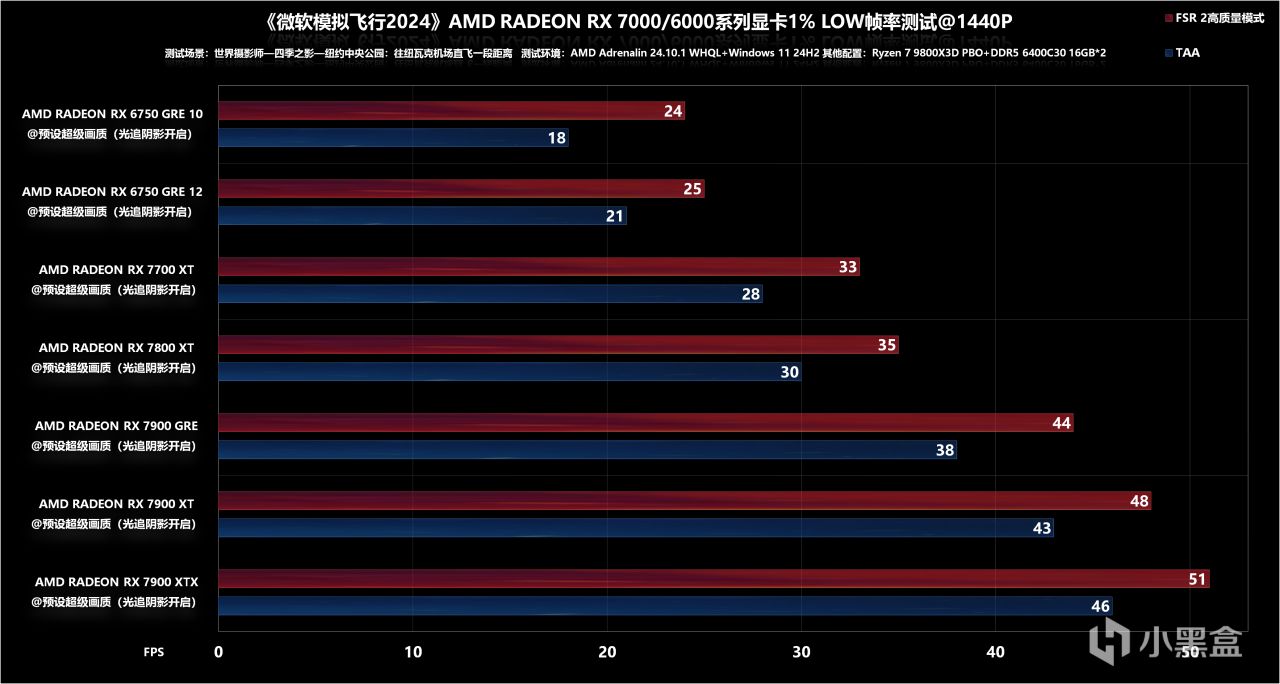 切换至2K分辨率,在TAA原生画质,显卡性能几乎瓶颈了所以9800X3D提升幅度较小,不过1% LOW帧依然稳步提升。当开启FSR释放显卡压力后,使用9800X3D就可以有效把显卡占用率推到99%,自然帧数提升就明显了。