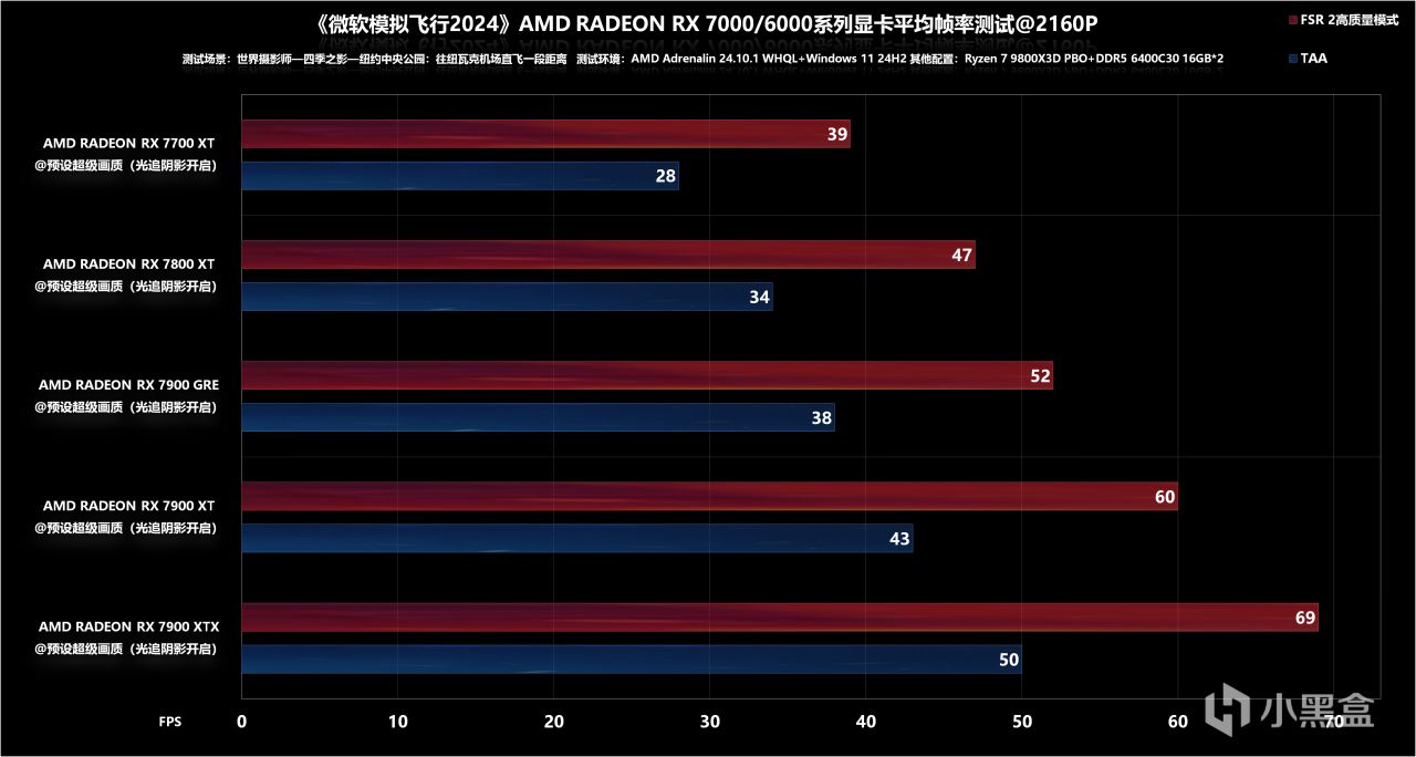 来到更高的2K分辨率,此时显卡入门条件就得提高到RX 7700 XT,TAA原生画质只能刚好达到45帧,建议开启FSR填补一下帧数更稳妥。此时想满足完美60帧就得RX 7800 XT以上了,另外RX 7900 XT是不错的甜点选择,开启FSR后能有平均80fps以上的水平,这个帧数区间已经能有接近高刷的体感。