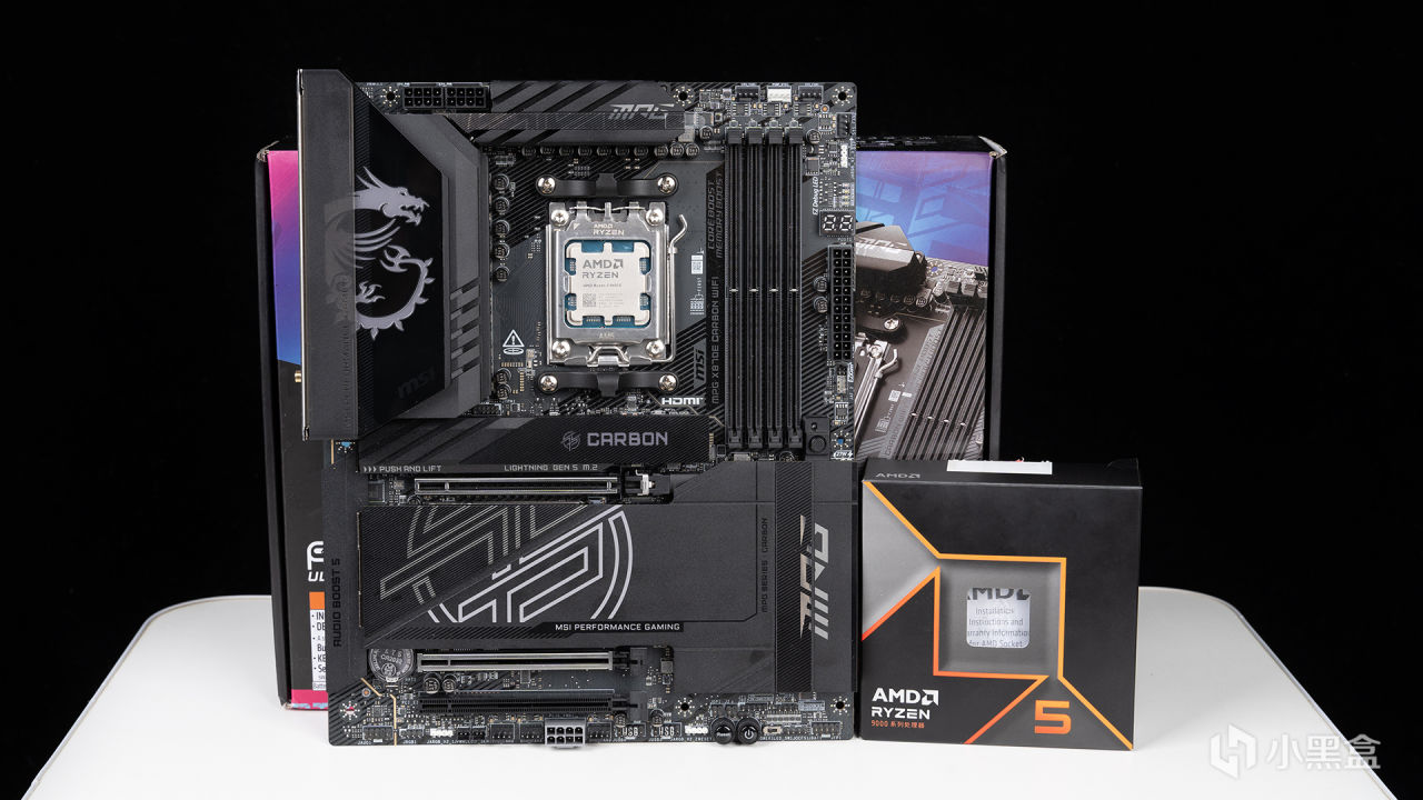 为了发挥出这两款锐龙9000的全部性能,这里搭配了微星MPG X870E CARBON WIFI暗黑这款主板,它采用了18+2+1路供电体系,核心Dr.MOS最大电流支持到110A,对于旗舰处理器都是完全过剩的用料。外观上结合了经典的家族碳纤维风格、黑镜龙纹以及斜纹装饰,它也只有龙纹和CARBON的简洁ARGB效果,很适合低调的黑色主题装机,除此之外,I/O接口丰富也是它的优势之处。