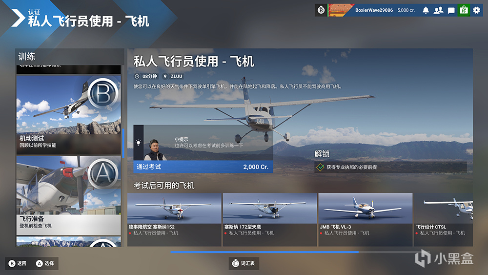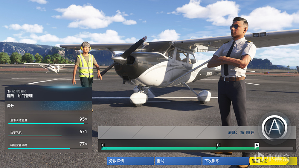 来到职业生涯,我们第一步就需要考取私人飞行执照,这是最基础的飞行员必备课程,左侧就有考证相关的训练教程,硬核作为小白也是全部体验了一番,结果发现部分项目只有B甚至C,结果正式考证时很快就挂科,也许熟练程度要全部达到A级才稳妥吧,显然这部分的玩法就足够小白折腾好几天了。