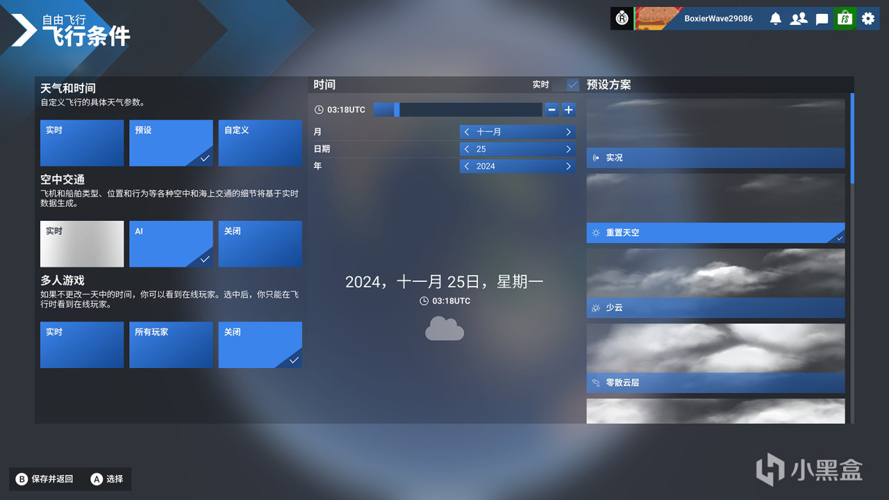 另外每次飞行时可以选择飞行条件,这个选项涉及和现实世界的实时数据互联,天气和时间、交通数据以及多人游戏都可以设置成实时,最大程度还原真实飞行时的状况,当然这也需要良好的网络条件支持,一般玩家建议天气和时间可以选择预设或者自定义(右侧选项还挺详细),而交通则是交由AI生成,多人游戏就看个人喜好了,以上截图也是这次测试中设置到的飞行条件。