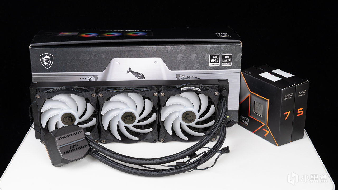 CPU散热器方面,为了保证两款锐龙9000处理器充分发挥性能,这里配备了微星MAG CORELIQUID M360迫击炮这款水冷,在其经典迫击炮系列风格的水冷头中,不但设计有ARGB灯效,而且内置高性能水泵方案,配合高性能风扇和微凸铜底,压制本身能耗比就不错的锐龙9000轻轻松松。