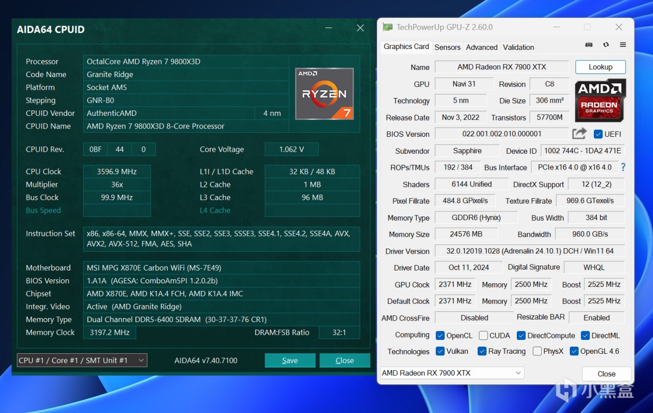 简单来过一遍测试环境,锐龙7 9800X3D开启PBO技术便于发挥最大CPU性能,CPU测试部分加入9700X进行多方位对比,搭配内存是两根DDR5 6400C30 16GB*2(UCLK=MEMCLK同频)组成双通道,并在BIOS中开启Resizable BAR技术达到最大化显卡性能,操作系统是Windows 11 24H2最新版本,显卡驱动是AMD Adrenalin 24.10.1 WHQL认证最新正式版,未对游戏有专属优化。