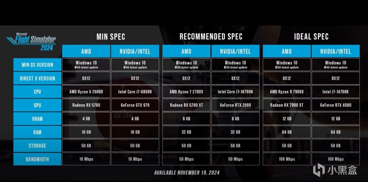 先来看一张关于《微软模拟飞行2024》的官方配置图,首先看到最低配置门槛并不低,A卡这边需要达到RX 5700,且相类似的显卡也要4GB显存,内存16GB。而随着画质提高,理想配置下CPU、显存、内存、显卡甚至网络带宽都一并大大提高要求,尤其是可能会被忽略的64GB内存,当然本次测试还是采用主流32GB容量的DDR5,有机会再给大家对比下32GB和64GB的性能区别。