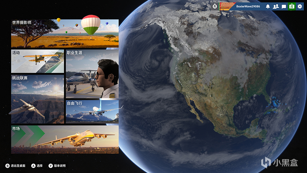 进入主界面,能看到有世界摄影师、活动、挑战联赛、职业生涯、自由飞行和市场六大模块,看到有挑战联赛和市场,就知道可持续游玩价值有多高了吧,不过个人觉得这款游戏最终归属是那些真正热爱飞行的小众玩家,像硬核一样的小白建议可以直奔活动或者职业生涯模块,在里面可以初步熟悉一下飞机的操作和交互界面,就可以开始观光了~