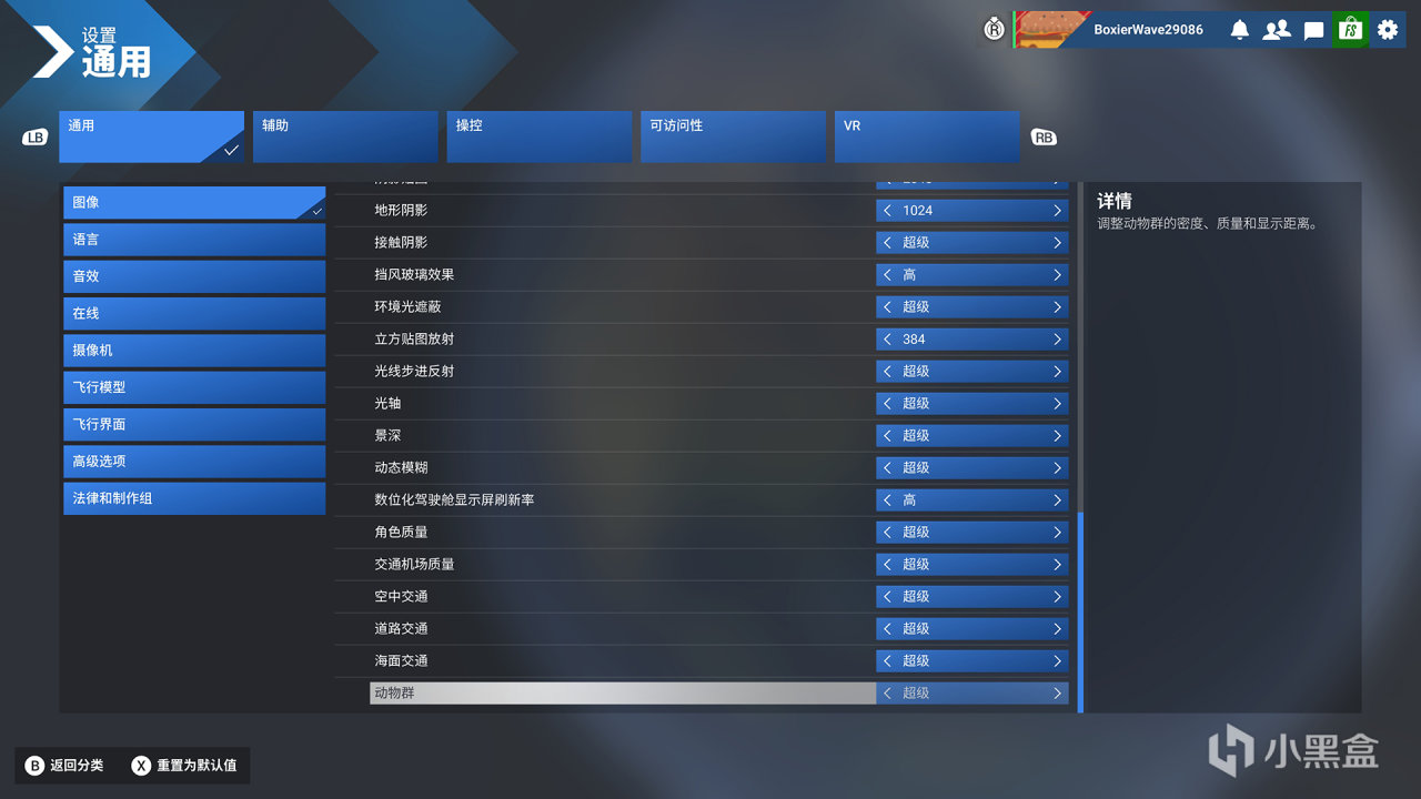 玩家也可以自定义画质,除了3A游戏中大家熟知的阴影、容积云、各向异性过滤、景深、动态模糊等常规选项。也有放在开放世界游戏品类中也是一流水平的选项——细分建筑物、树木、植被、岩石、青草、水波、角色质量、动物群、地形细节水平等选项。