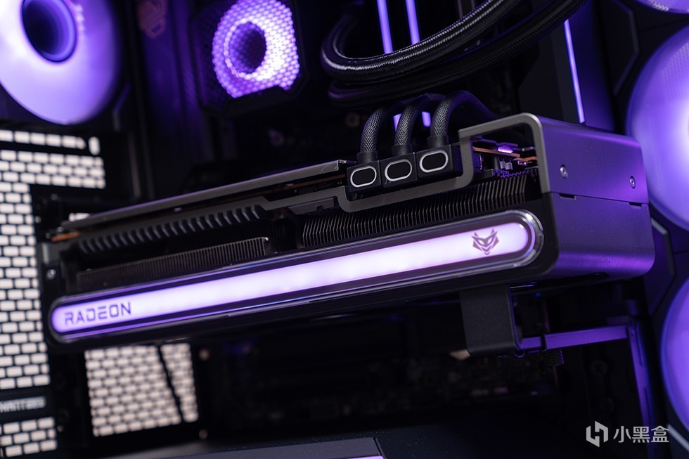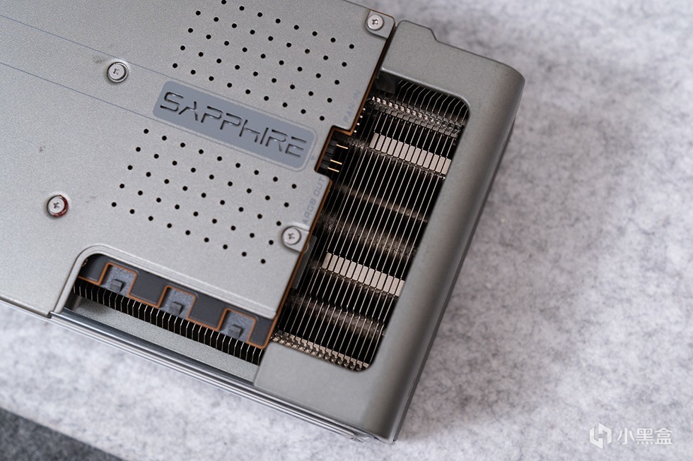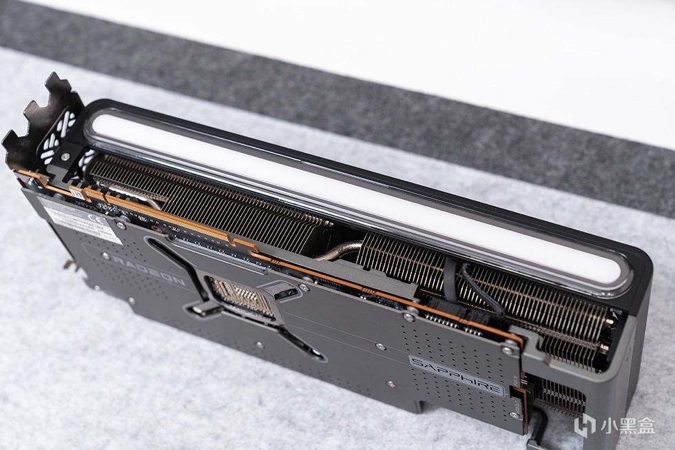 顯卡上下兩側都設計了貫穿式的長條LED RGB燈帶,支持5V ARGB燈效,並帶有RADEON和超白金系列的LOGO,通電後氛圍感充足。從側面可以看到細密的排布的散熱鰭片,內部搭配7根鍍鎳熱管,與核心接觸部分採用了大面積高效能均熱板,覆蓋整個核心區和顯存域能快速帶走熱量。