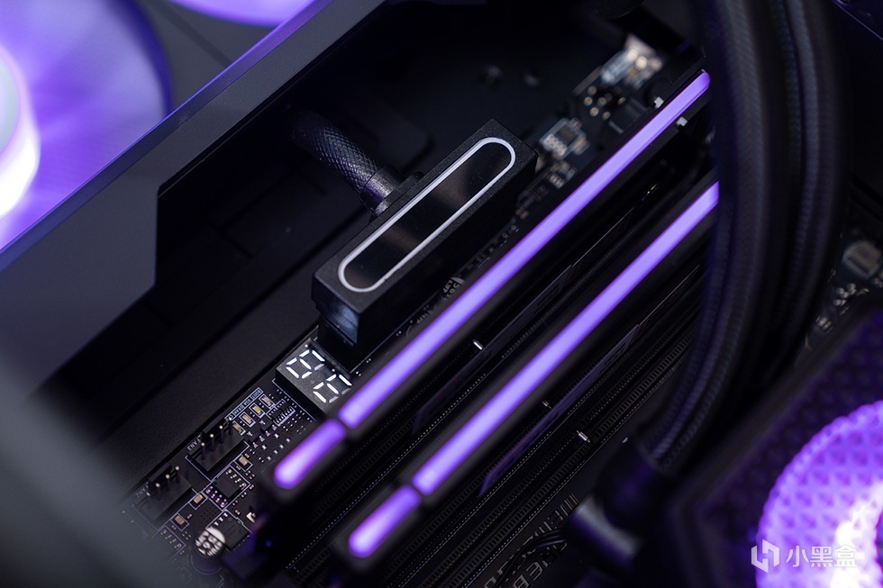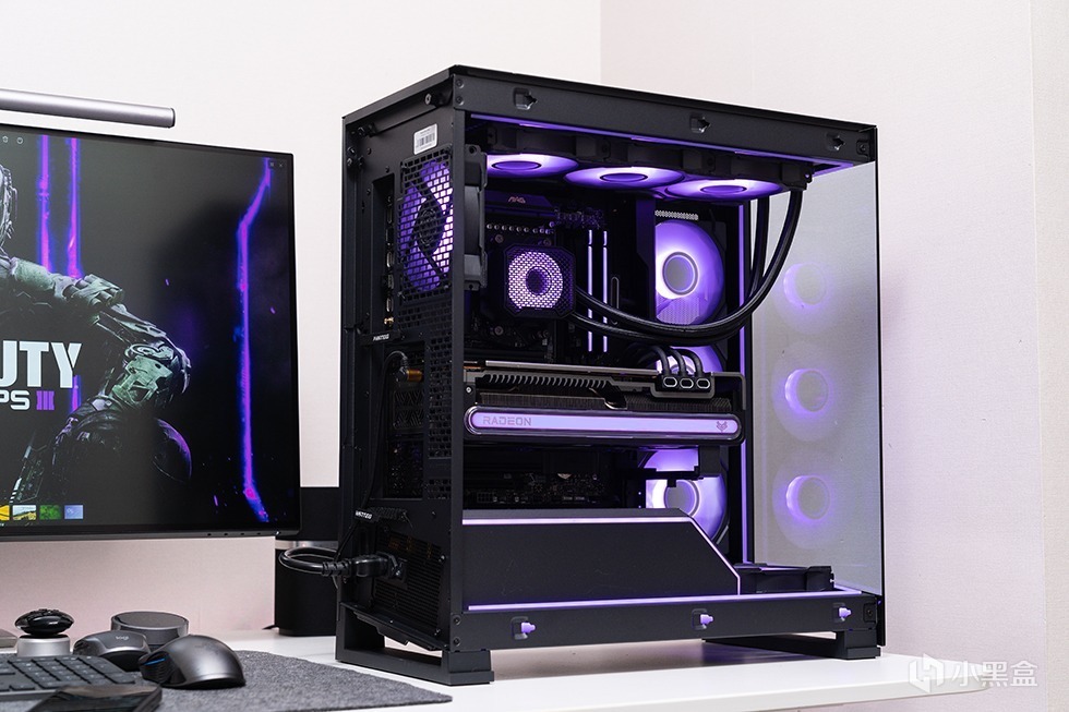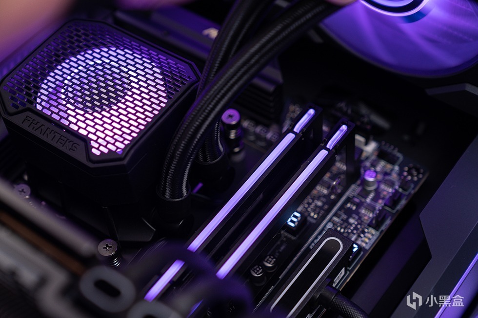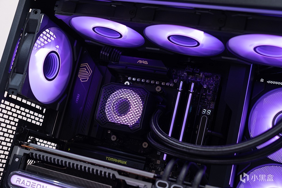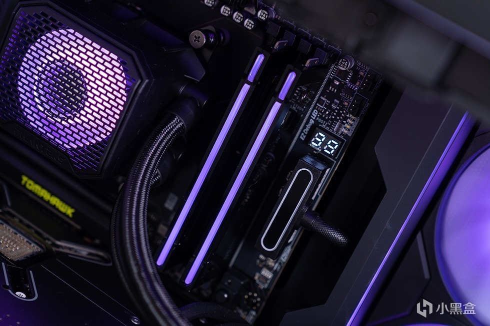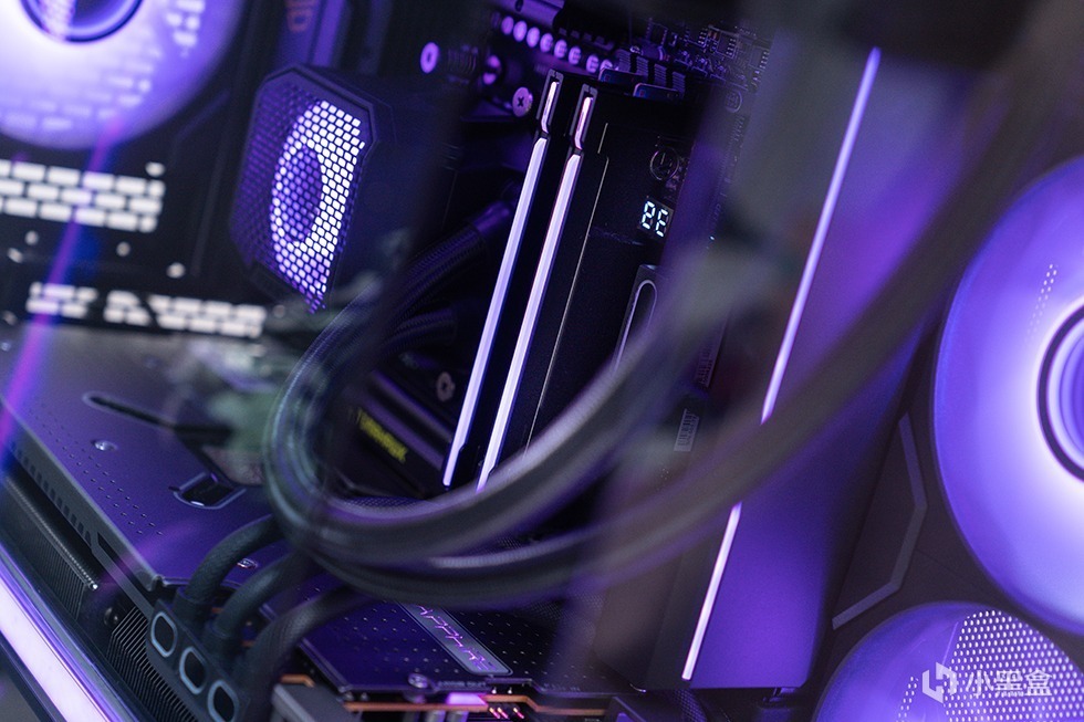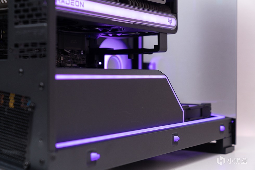 整機以追風者 NV5爲主框架,搭配機箱燈光套件以提升氛圍感。NV5側透無立柱的設計,可以很方便的展示燈光效果。個人不喜歡ARGB的花裏胡哨,所以機箱內所有燈光統一使用紫色燈效。