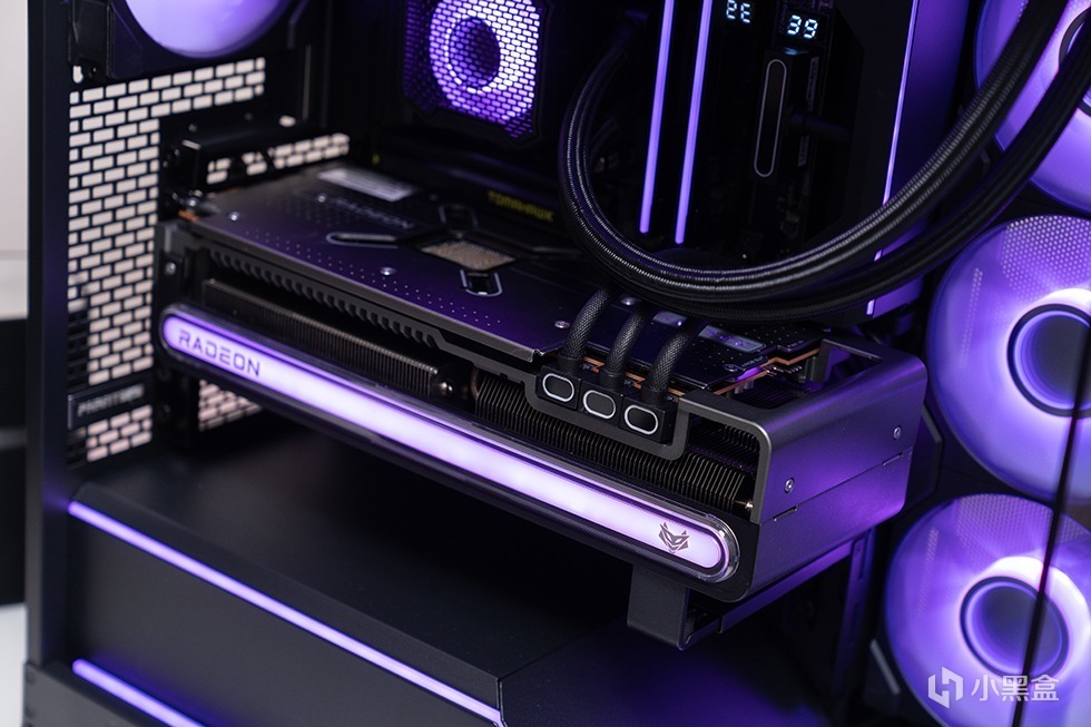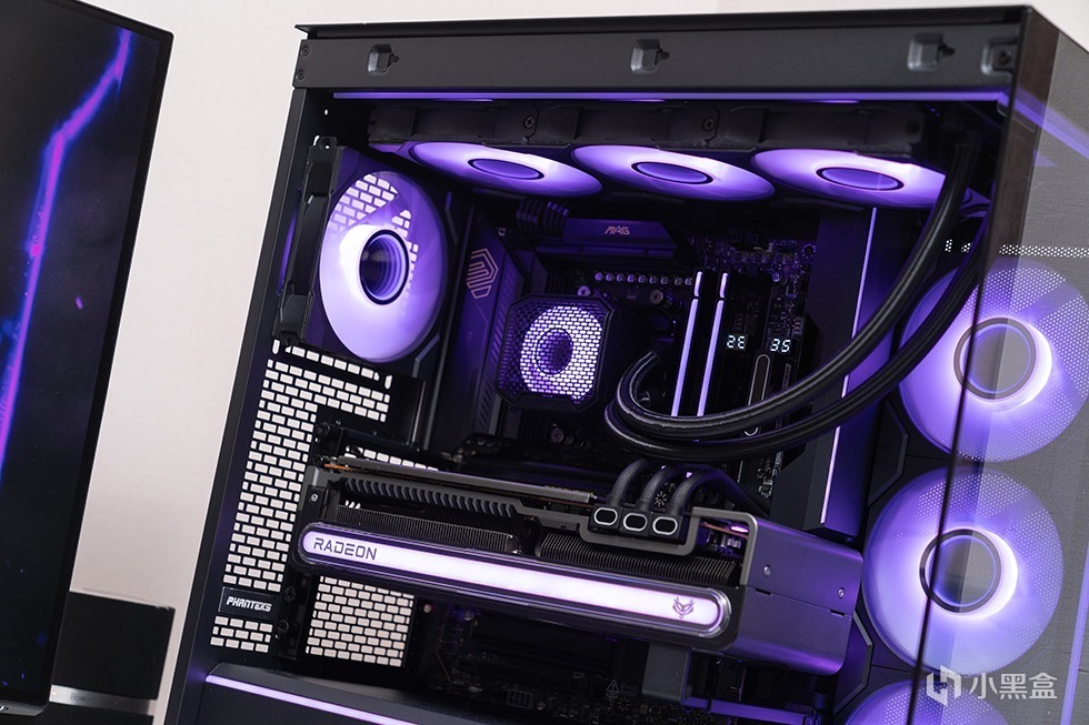 移除側板後內部裝備LOOK,顯卡直插,頂部爲360水冷,側面和底部分別配備了3+1顆反向風扇作爲進風,尾部的風扇和頂部的冷排風扇負責出風,風道還是比較常規的。