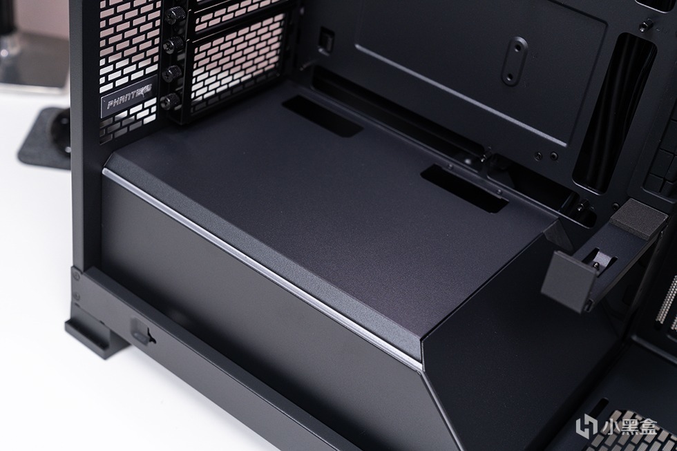 機箱內部最大支持E-ATX(最大305 x 280 mm)規格的主板,支持背插,有7個PCI擴展槽,CPU散熱器限高180mm,顯卡限長440mm,支持豎裝顯卡。散熱風扇位置方面,頂部位置可安裝三個120mm風扇,支持120/240/360水冷;後置位置可安裝一個120mm風扇,支持120水冷;側面位置可安裝三個120mm風扇,支持120/240/360水冷;底部位置可安裝一個120mm風扇,不支持水冷。