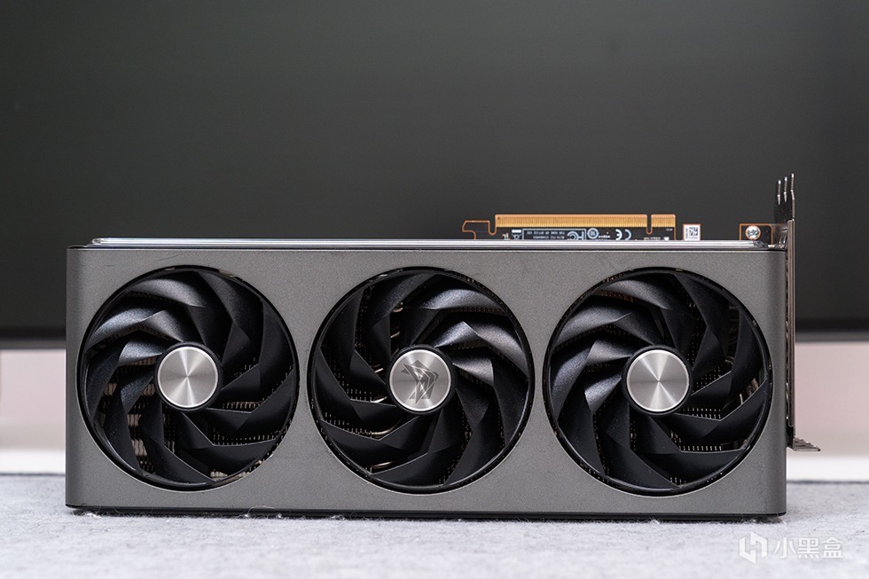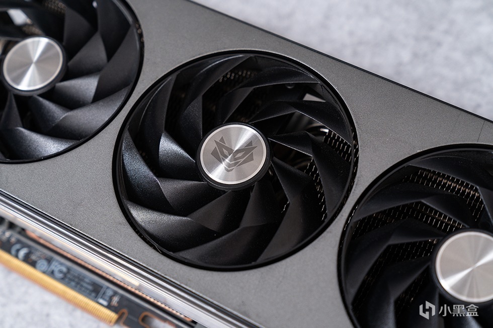 藍寶石 RX 7900 XTX 24GB D6 超白金 OC尺寸爲320×136×72mm,採用高強度鎂鋁合金框架,兩端做了圓弧過渡處理,銀灰色的金屬導流罩搭配三枚9.5CM直徑的軸流+雙滾珠軸承結構風扇,顏值和散熱效能雙雙拉滿。