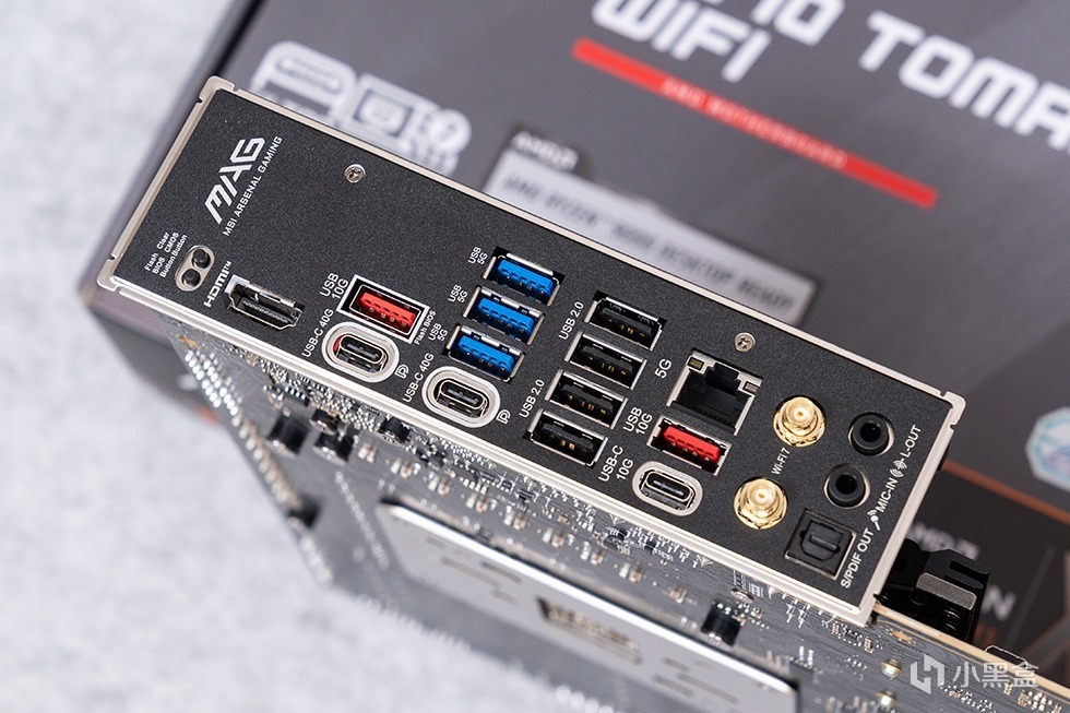 後置I/O區域採用了一體式I/O背板,提供了Clear CMOS按鈕、Flash BIOS按鈕、HDMI 2.1、2*Thunderbolt 4、1*USB Type-C 10Gbps、3*USB Type-A 5Gbps、4*USB 2.0、5G有線LAN、2*USB Type-A 10Gbps、Wi-Fi 7天線接口以及帶S/PDIF輸出的音頻接口。