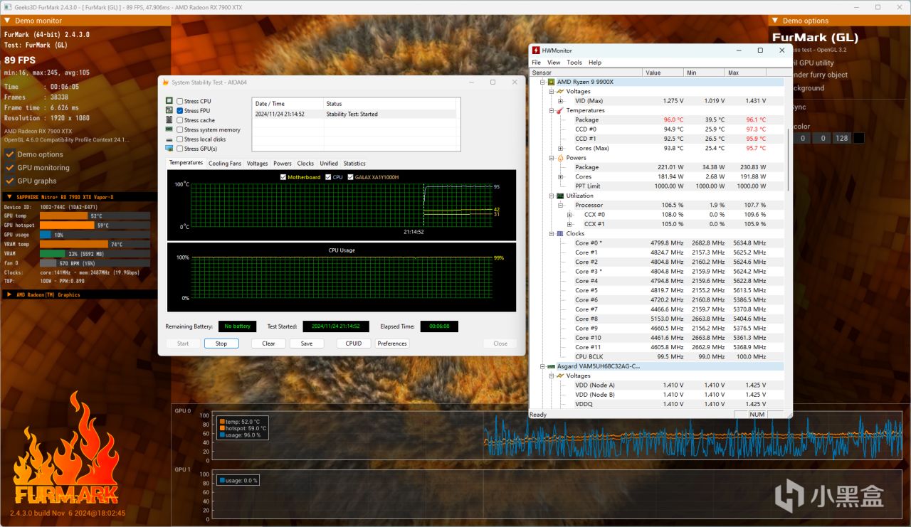 首先看一下雙烤的溫度:PBO開啓,CPU功耗230W,最高溫度95℃撞牆,顯卡溫度52℃。。