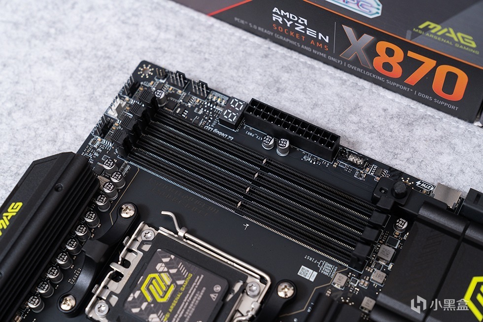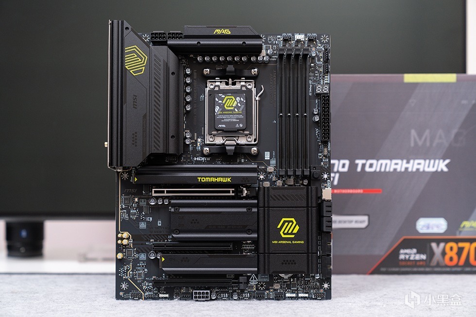 微星 MAG X870 TOMAHAWK WIFI 爲標準的ATX版型,基於AMD X870芯片組,主板的VRM(CPU供電區域),SSD安裝位,南橋芯片位置均覆蓋了厚重的黑色鋁製散熱裝甲,搭配機甲紋理給人濃濃的戰鬥風格。