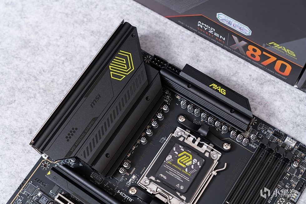 核心配件主板來自MAG X870 TOMAHAWK WIFI,搭載真正的Wi-Fi 7 解決方案、5G LAN、USB 40Gbps、PCIe 5.0 解決方案、PCIE拓源架構設計,以及獨家EZ DIY 功能,是爲AMD Ryzen™ 9000 系列處理器的絕配座駕。VRM散熱片上有明顯的MAG圖形及字母標識。