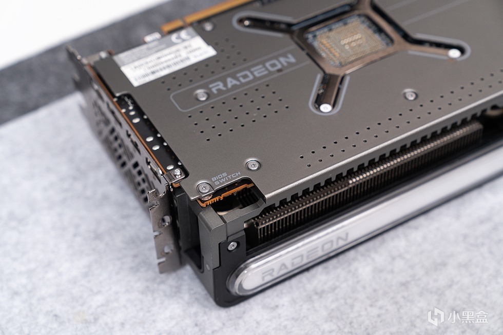 顯卡的BIOS切換開關靠近擋板區域,帶有TriXX軟件控制、主BIOS(OC)、次要BIOS(低功耗)雙BIOS設置,滿足不同玩家的性能需求。供電接口設置在另一端,8pin*3常規接口設計。