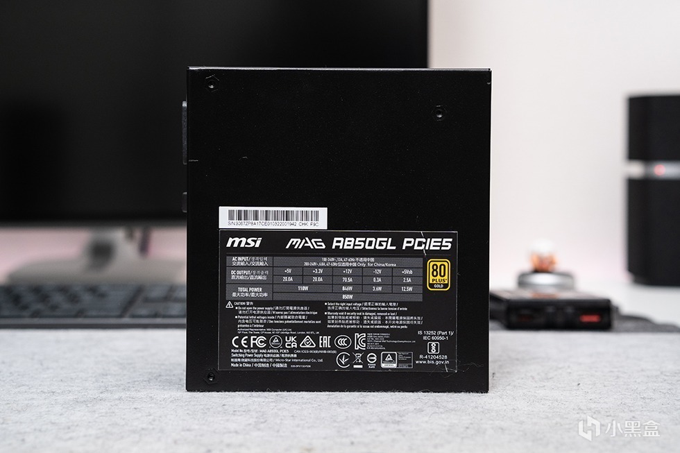 微星 MAG A850GL PCIE5電源支持ATX 3.0標準以及PCIe 5.0,通過80 Plus 金牌認證。採用緊湊型全模組設計,作爲一款ATX電源體積爲140 mm × 150 mm × 86mm,內置一枚120mm FDB動態液壓軸承風扇,正面散熱柵格密集排列,使電源在冷卻性能和噪音水平之間取得良好的平衡。