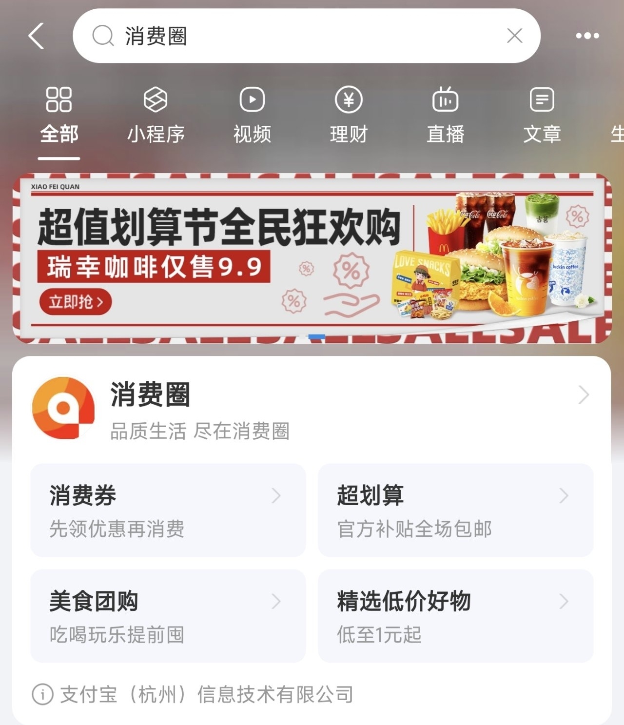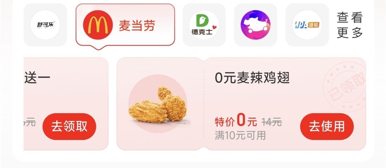 4.消費券。敲小黑板,劃重點。支付寶裏面搜索消費圈進去可以領券。喜歡喫M麥當勞的有福啦,直接免費領麥辣雞翅一份~(要滿十塊錢才能用)配合13.9的低保套餐,剛剛好就是一頓(當然對我這樣的喫貨來說還得多喝點水才能飽腹)