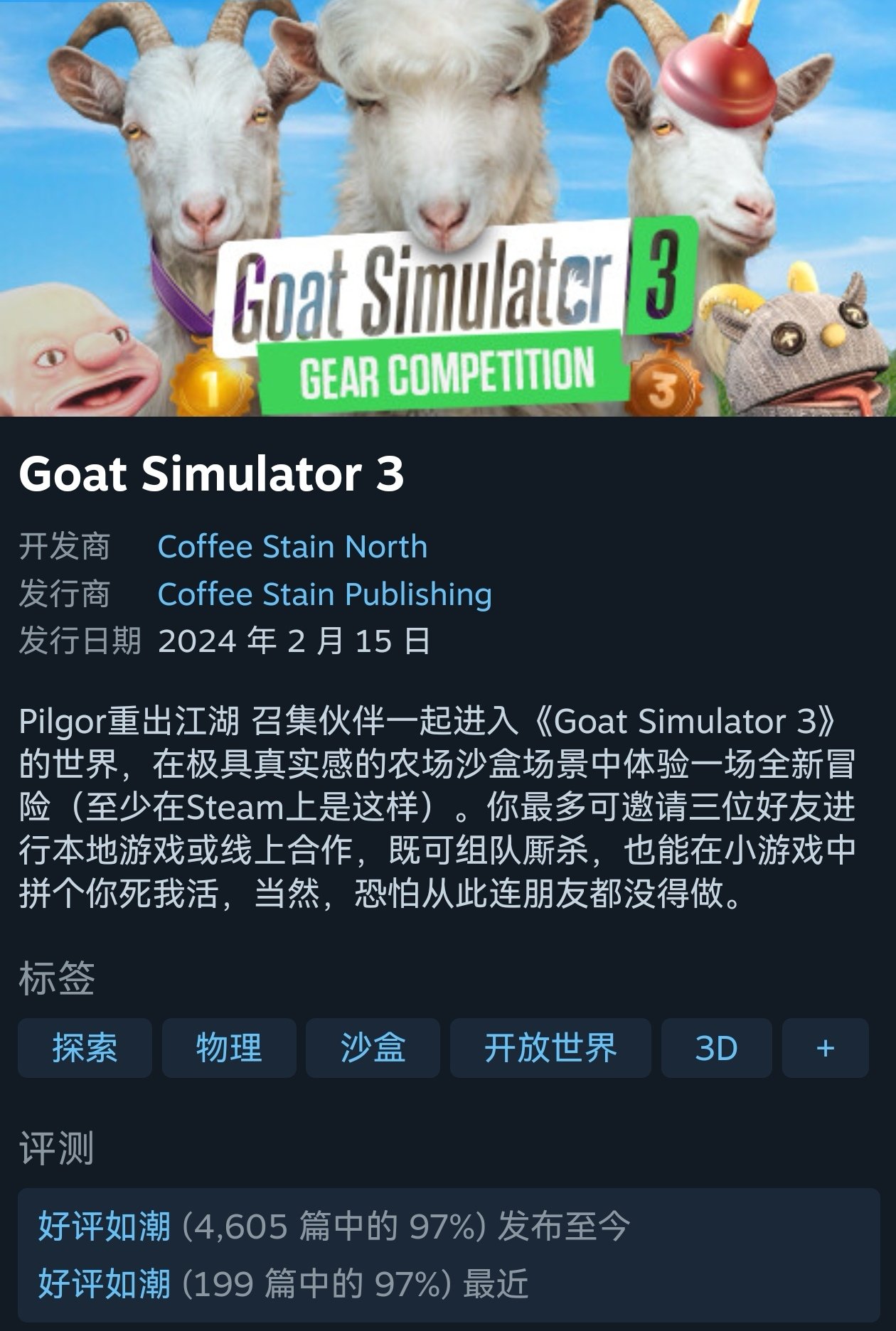 2022年11月17日,《模拟山羊3》发售,登陆PS、Epic、XBOX平台。