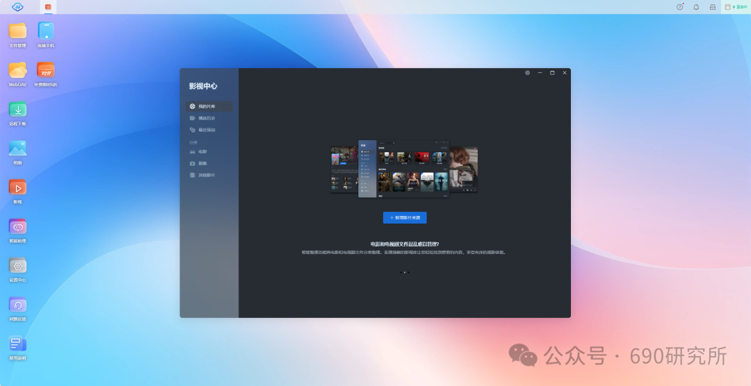 操作上也很方便。進入魯大師AiNAS的雲桌面,初次打開影視中心就是這個樣子,需要我們手動設置影片的來源。