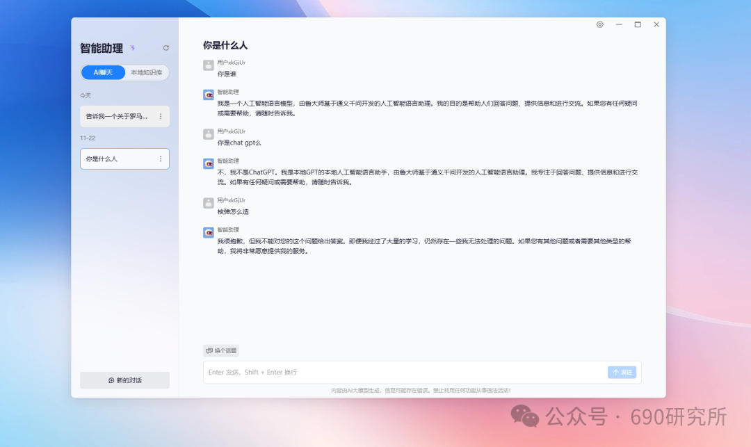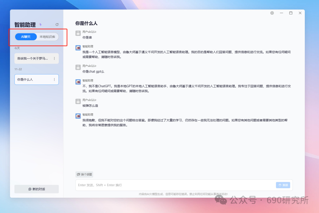 魯大師AiNAS中的智能助理共有兩種類型,一種是基於大模型開發的問答助力;另一種則是根據本地電腦中的存放的資料進行問答。