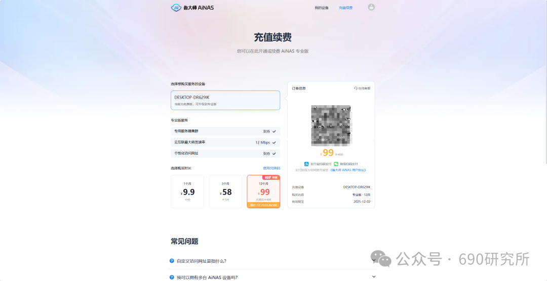 當然想要更快的內網穿透服務也不是不行,這就得購買魯大師AiNAS的套餐了。目前活動價99元可以開通一年,內網穿透速度能夠達到12Mbps,這個速度外網下使用基本上不成問題了;日常正常價格168一年,其實也還好。