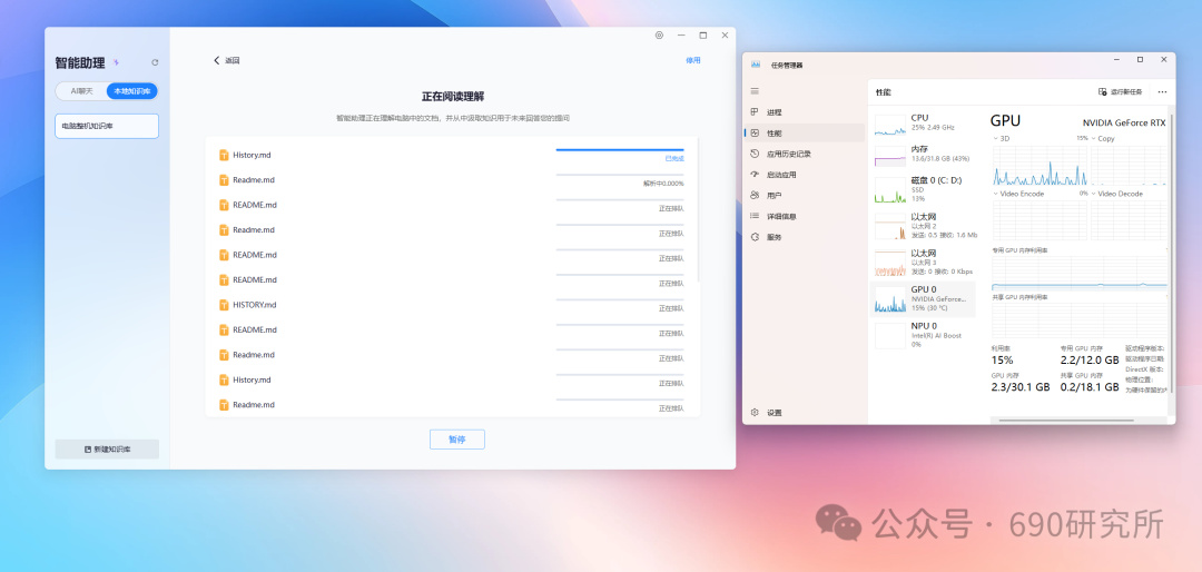 第二種就有點意思了,我將其激活,發現它會對本地電腦中的文件進行收集提煉,並且調用GPU進行Ai運算。這樣的方式除了可以根據自己的實際情況進行問答之外,另一方面還能確保機密文件的安全,畢竟是在本地進行運算的Ai。