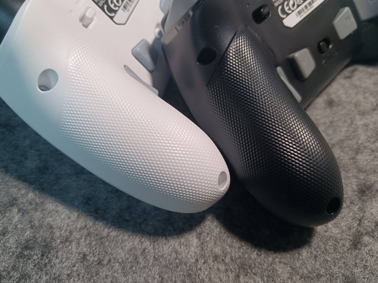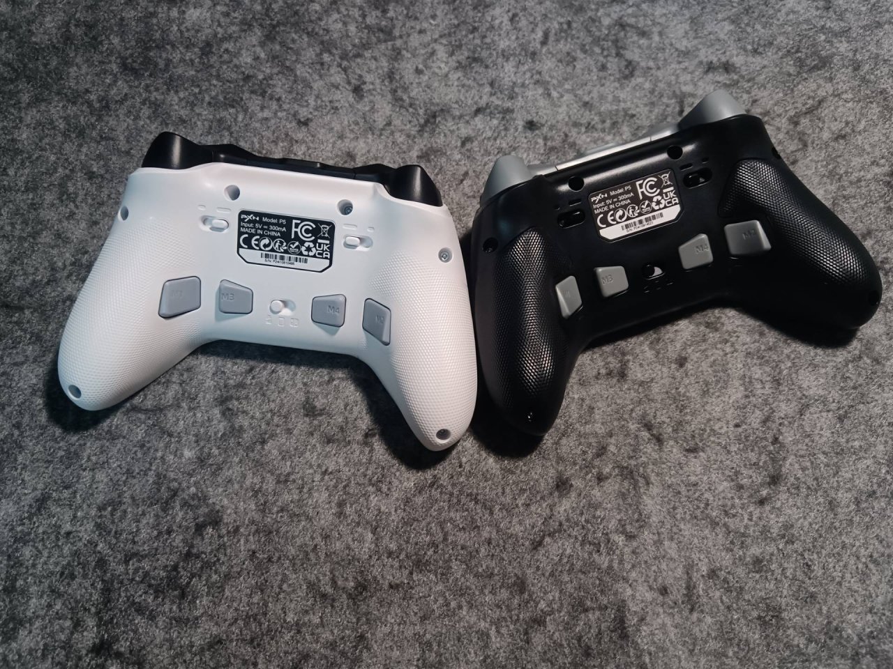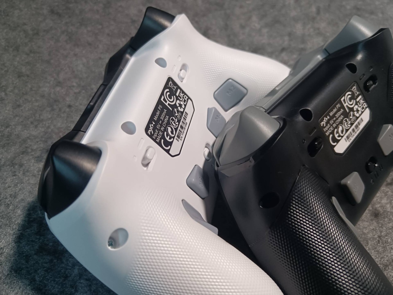 接下來就是手柄背面了,第一眼就看到了一字排開的四顆背鍵,並且按鍵形狀是針對握持的姿勢做了適配的,很容易就可以勾到按鍵,背鍵中間是做了一個切換連接方式的撥杆開關,扳機部分可以看到是做了兩段式扳機鎖。
