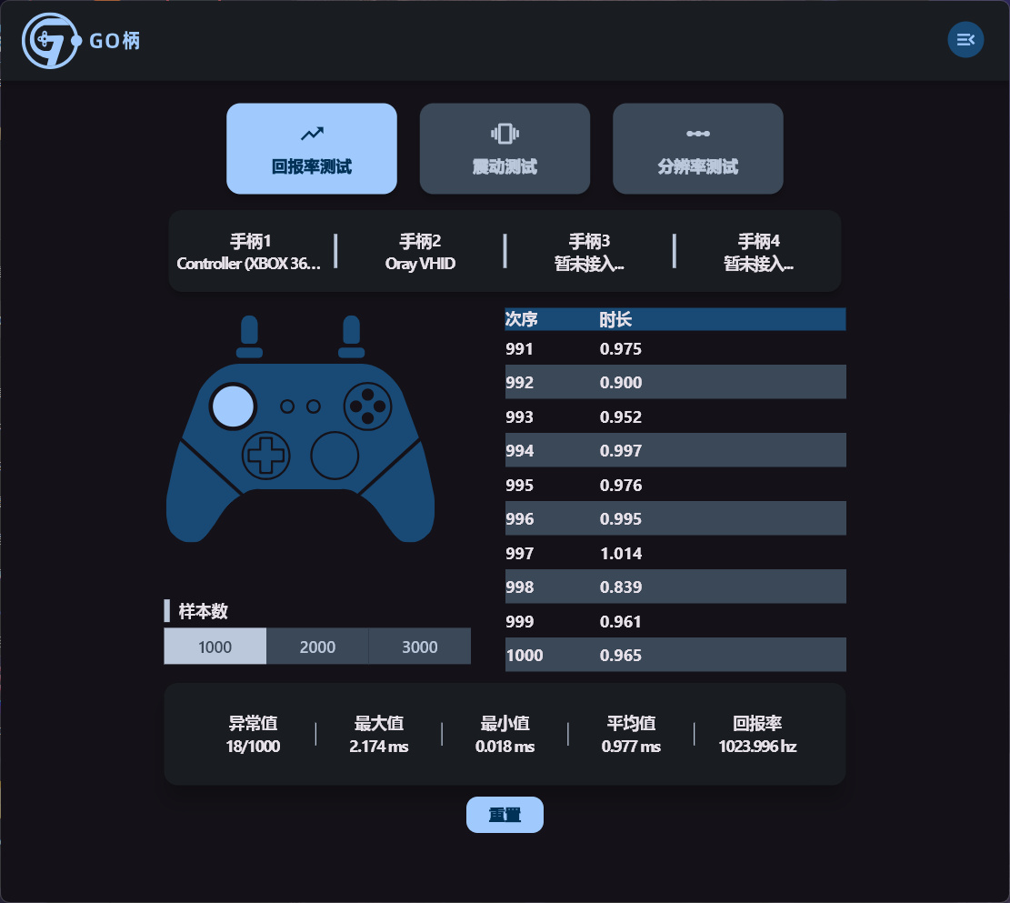 回報率方面,有線連接狀態下,實測在1000Hz;2.4g連接狀態下,實測也是在1000Hz;藍牙連接狀態下,實測在130Hz。其實在這個價位,在它之前的產品有線一般是500,2.4g一般也是在125左右,但是這東西出來之後直接上雙1000Hz我是真沒想到,後面出的同價位手柄我認爲是很有可能看齊,進入全員雙1000Hz時代。