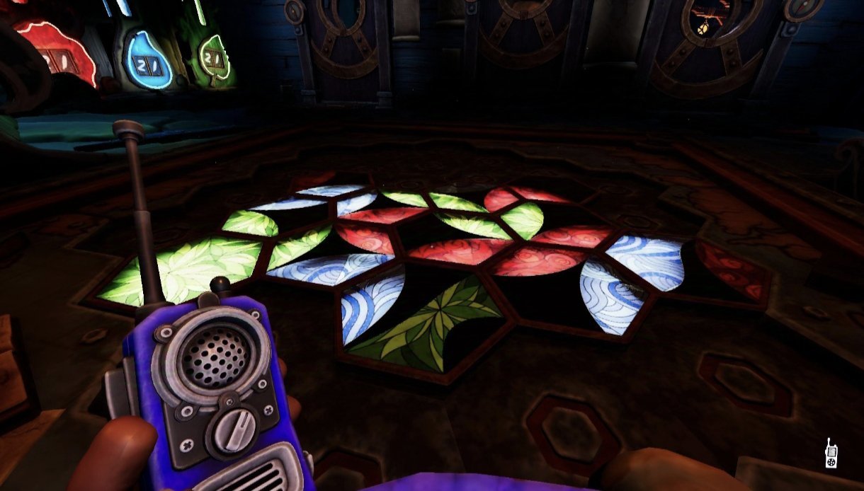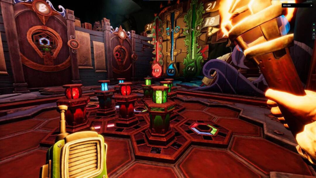 第三關:一個人進門之後會被海妖詛咒,畫面變得暈暈乎乎,看到的魔幻世界都是假的!不要相信!路是假的,路障也是假的!另一個人從上面縱覽全局,給喝假酒的人指路。一共九個燈塔,全部按下點亮就能拿到金票