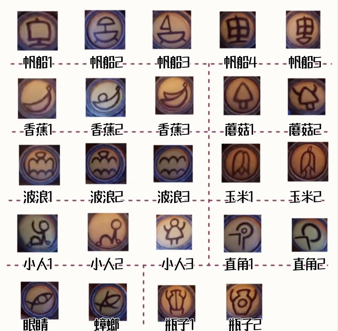 建議:給符號直接給起一個代號,然後對照着代號表(如果默契高一點也可以起具有描述性的,如:十字倒三角帆船,這樣可以不用對照這個表)