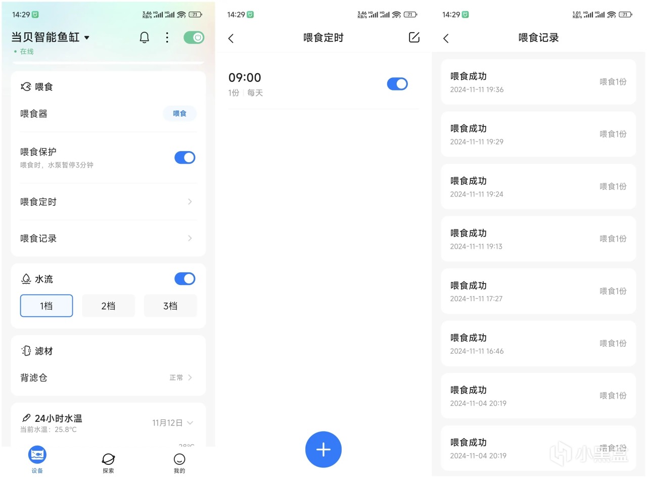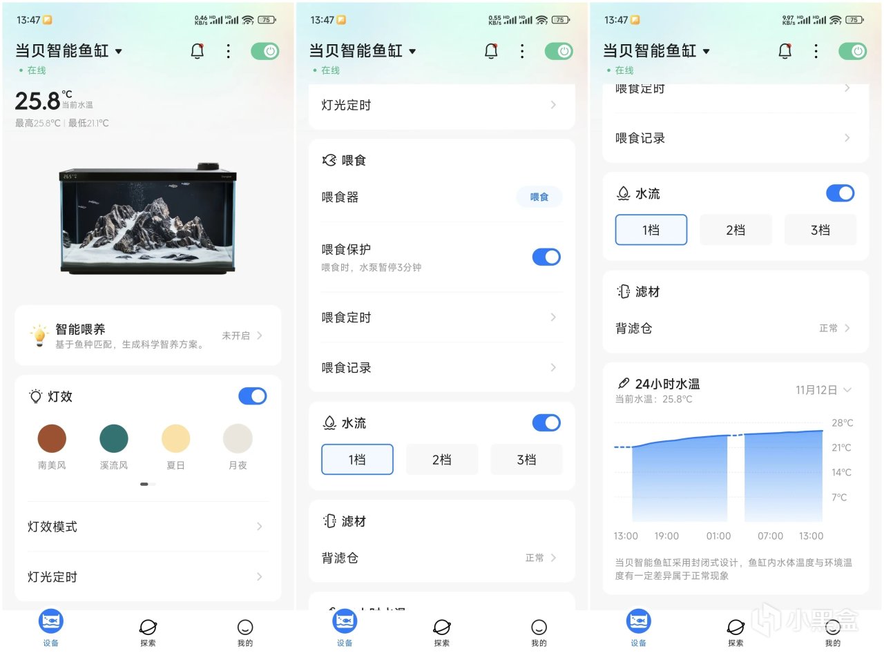魚缸支持接入手機APP,可以手機端遠程操控,能隨時隨地查看魚缸狀態,進行個性化設置與調節,解決99%的養魚難題,讓養魚真正成爲一種享受。下載安裝當貝+APP,登錄綁定設備,就可以使用手機管理魚缸,在APP界面中,可以查看魚缸當前網絡狀態、魚缸實時溫度,可以對魚缸的燈效、餵食、水流、濾材、24小時水溫等內容進行設定,用戶可以根據自己養的魚種和習性設定以上內容。