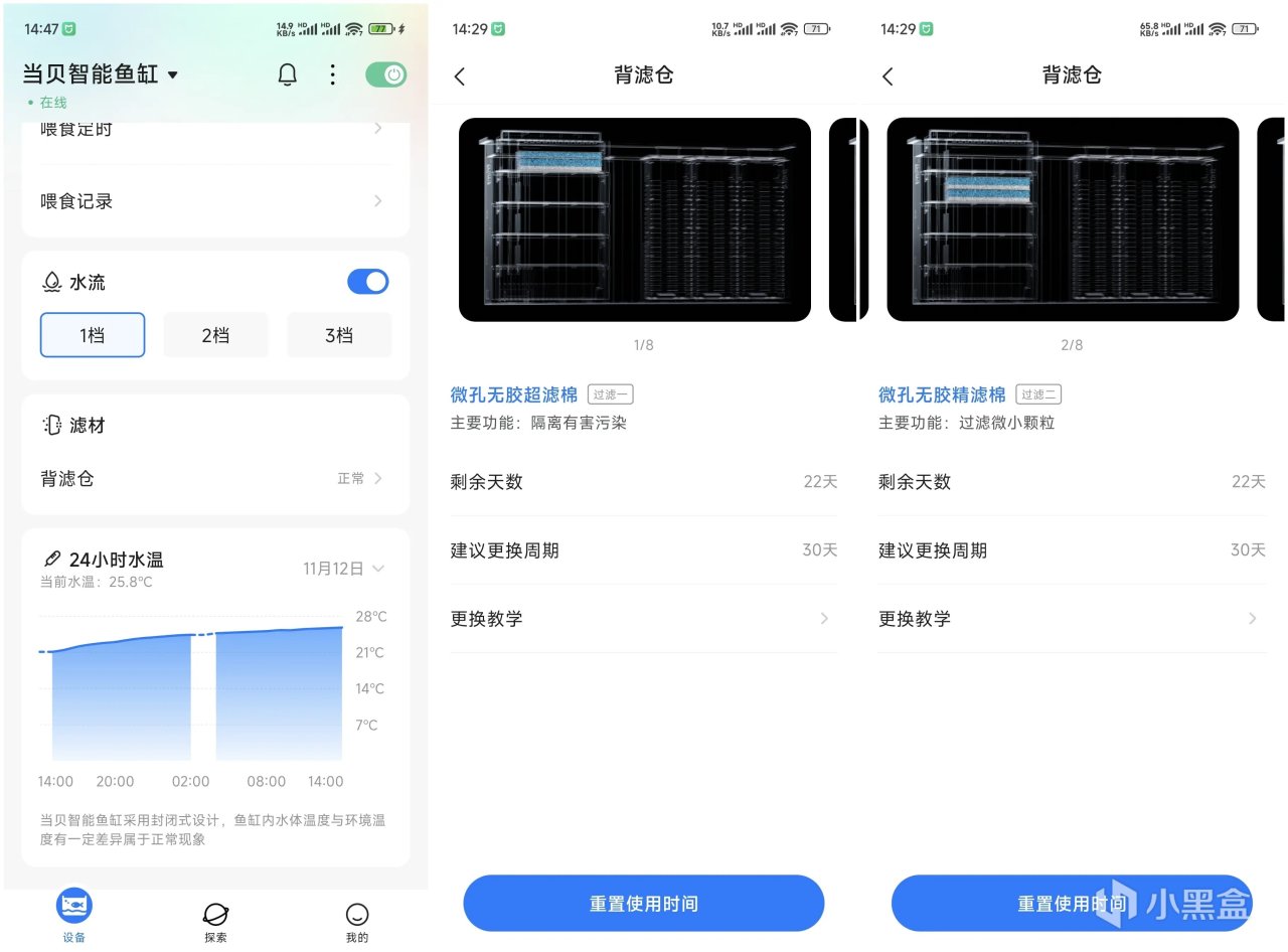 對於養魚小白來說,最重要的就是缸內水質,穩定水質就是要靠背濾濾材,魚缸自帶AI水質檢測,當APP端顯示濾材異常時,就需要及時更換清洗濾材,APP端對背濾倉內濾材位置、名稱、功能,使用剩餘天數、更換週期做了介紹,同時有更換教學視頻,小白也能輕鬆維護。