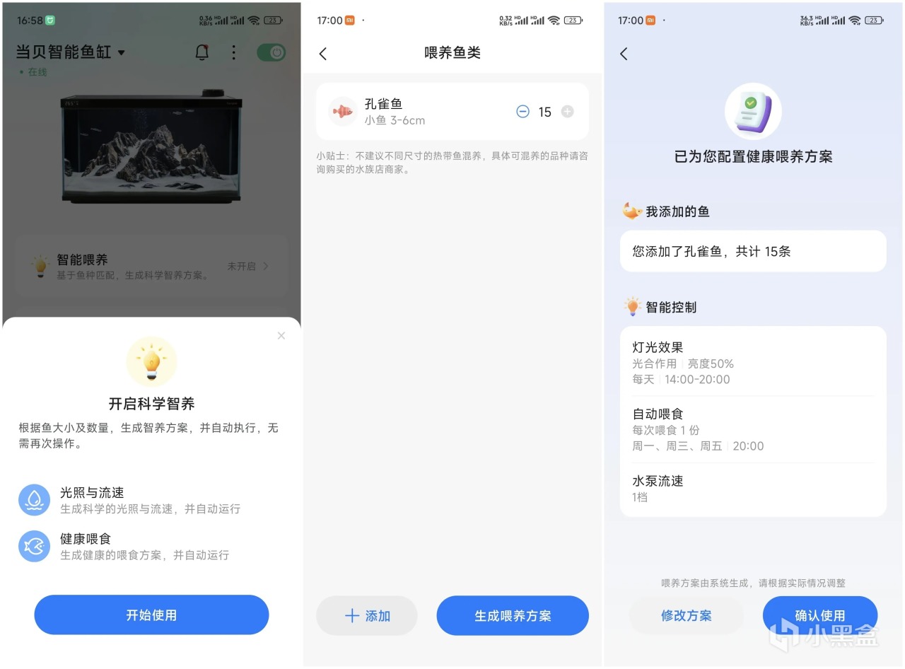 當貝AI智能餵養系統通過收集近1000種魚的餵養信息,建立一個龐大的數據庫。使得餵養更加精準,有效控制魚的健康與存活週期。在APP種設定魚的品種、大小和數量,一鍵開啓智能餵養模式,餵養系統會自動生成餵養方案,對燈光效果、自動餵食次數,水泵流速等自動設定,用戶也可以根據實際情況修改適合自己的方案。