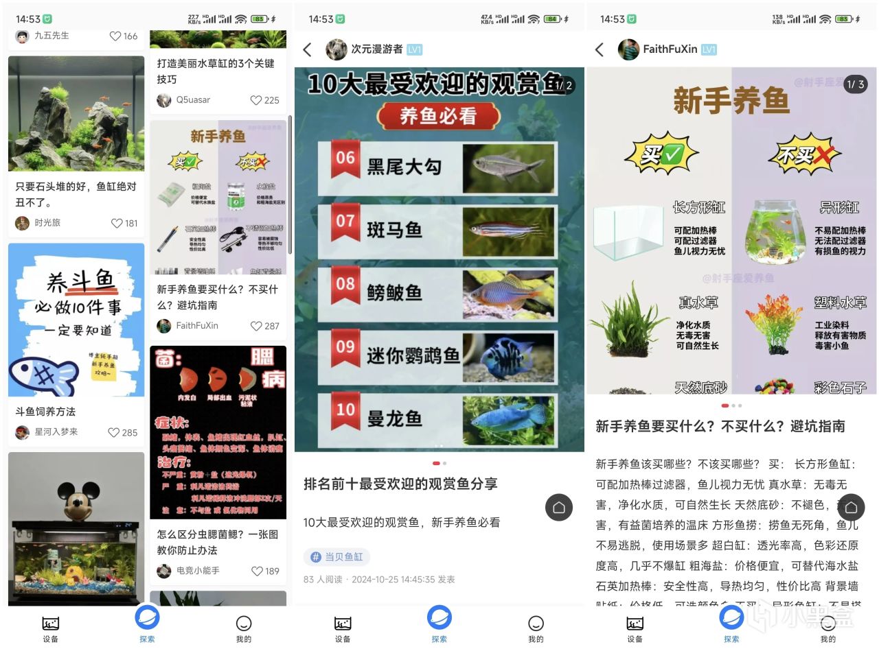 APP端探索頻道提供豐富的養魚知識,涵蓋魚缸景觀設計、魚類養護、魚類品種介紹以及養護技巧等多個方面的內容。對於初次涉足養魚領域的新手,該頻道將成爲您學習魚類養護知識的一個重要平臺。在這裏,您可以從基礎的魚缸佈置和魚類養殖學起,逐步掌握各種魚類的生活習性和飼養方法,爲您的愛魚打造一個健康舒適的生活環境。
