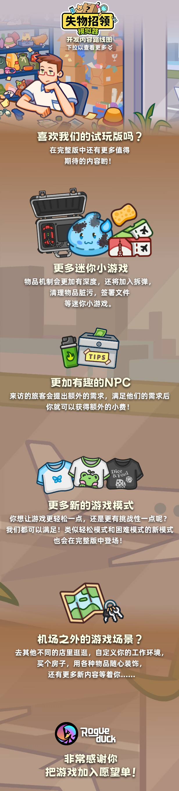 扮演机场工作人员,在失物招领管理处整理并向失主提供其所需的失物的小品级休闲游戏。游戏基于GameJam作品进行扩充与开发,玩法就是比较常见的有少量解谜要素的寻物类,画风也比较卡通,总体来讲还算有趣。