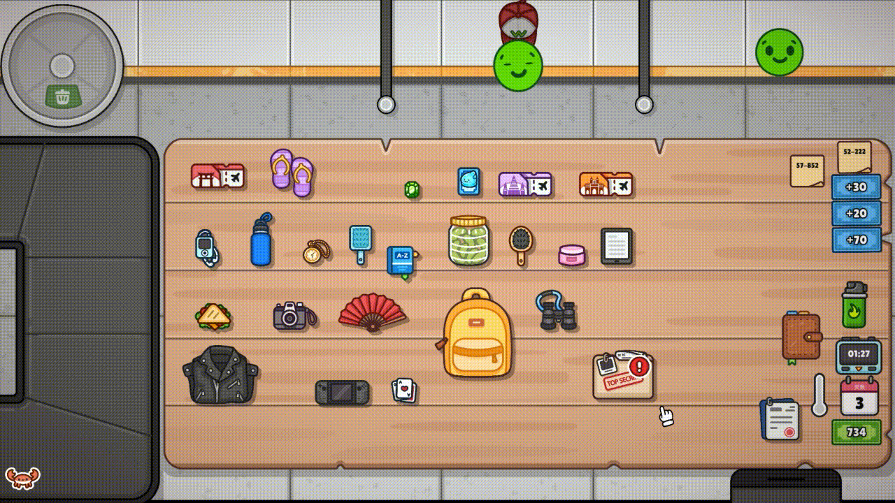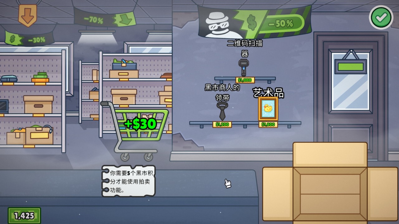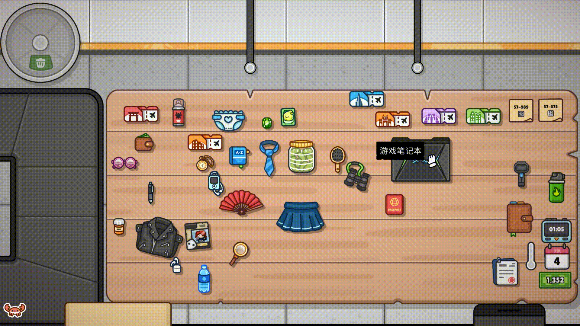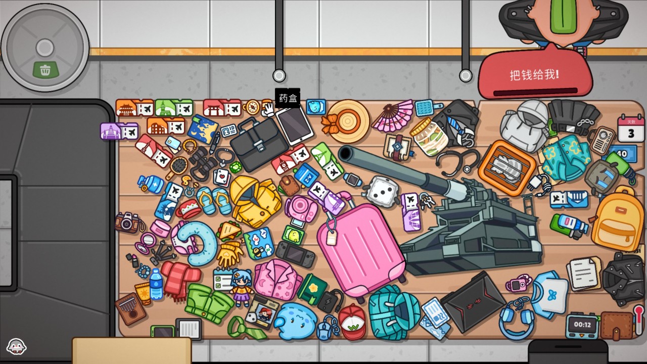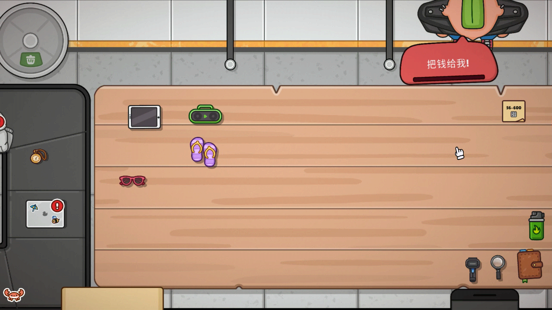 除去正常的通过将失物交还给失主外,制作组在游戏中还为玩家提供了另外一种赚钱途径——黑市交易。玩家可以选择将一些高价值的物品放进窗口左下角的箱子里(别想了,坦克放不进去),然后将其带到黑市进行出售。(放进箱子的物品不能再取出来,也能通过传送带重新刷新)