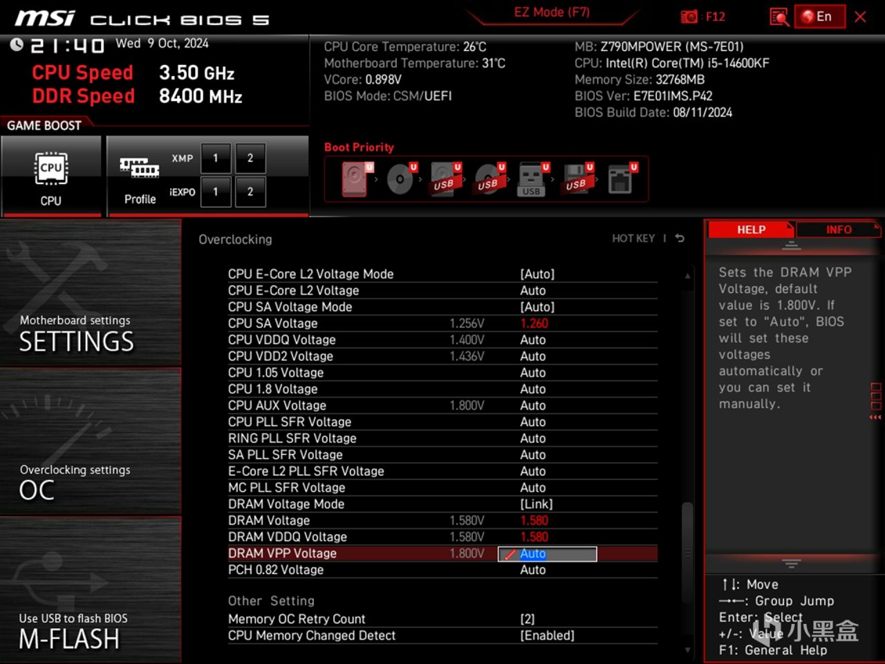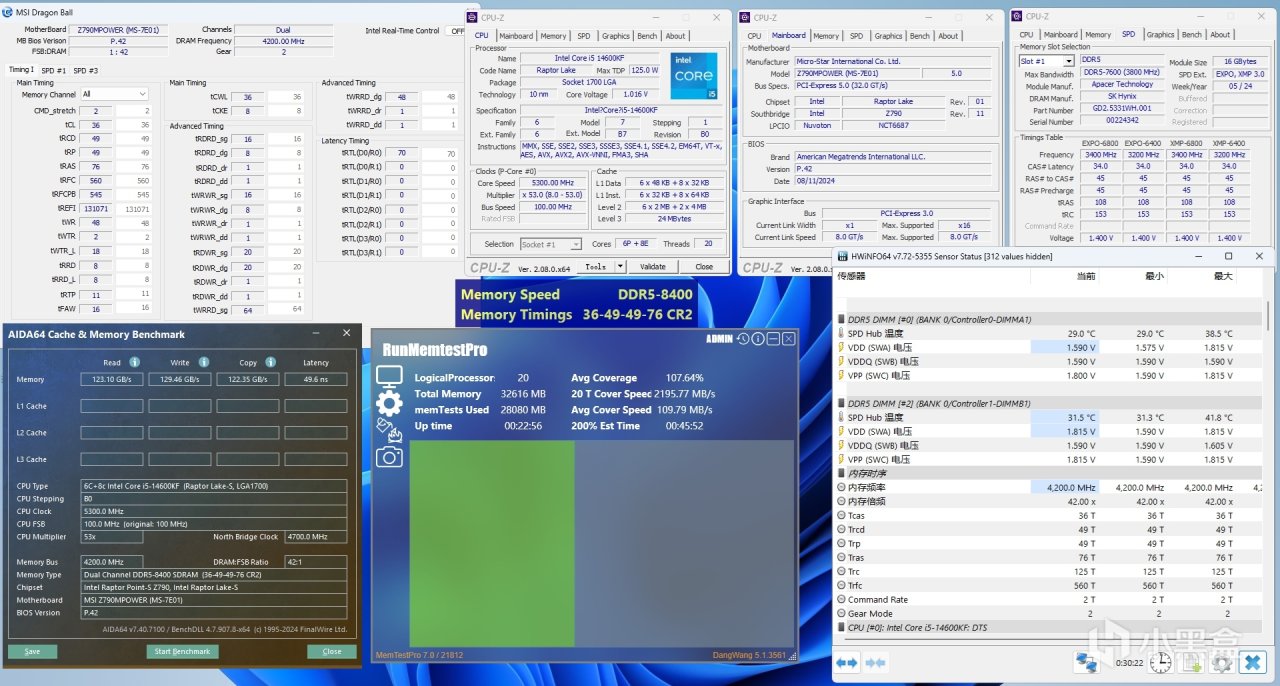 最後再來試下這套宇瞻ZADAK DDR5 7600 16G*2內存的手動超頻的上限可以達到什麼程度,因爲拿到手上也不能保證這套內存的“體質”是否OK,在反覆調試下,衝擊8400頻率是沒有任何問題的,要是再往上衝擊更高的頻率我手上這套ZADAK DDR5 7600 16G*2是上不去了,那麼8400的在微星Z790MPOWER主板上的一些設置參數以及出來的能效數據以及延遲表現供大家參考一下。
