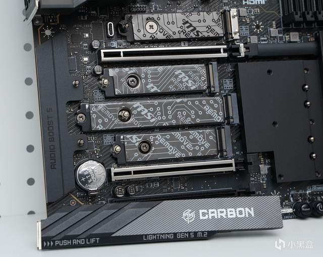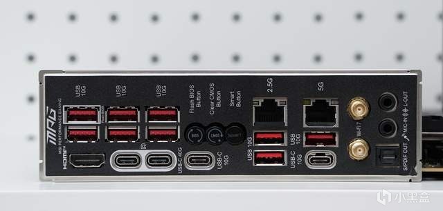 微星MPG X870E CARBON WIFI暗黑主板的I/O接口规格相当超前且丰富:9*USB 10Gbps Type-A、2*USB 40Gbps Type-C、2*USB 10Gbps Type-C、1*HDMI 2.1、5G+2.5G RJ45有线网口(一个连NAS一个上网美滋滋)、Wi-Fi 7无线网口、3*3.5mm音频接口。值得注意的是它还有战未来的USB4接口。