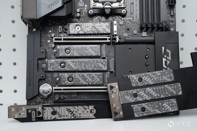 主板搭载了四条DDR5内存插槽,支持EXPO和A-XMP协议,最大支持容量为256GB,最高支持超频至8000MHz频率。当然,微星独有的MEMORY TRY IT也是必不可少,更是新加入了High efficiency mode模式,优化内存参数,提升效能。内存插槽也内置了加固处理。
