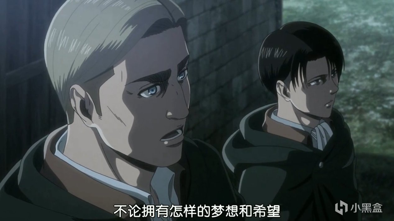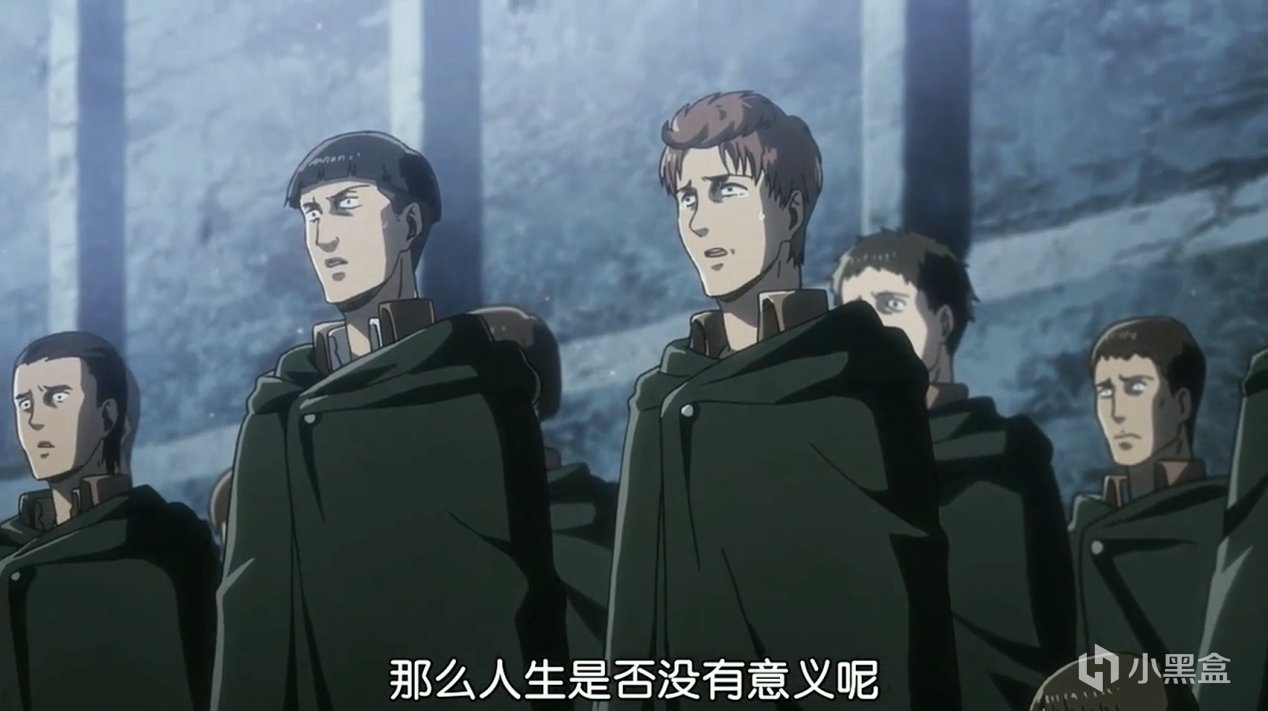 這裏讓我想到《進擊的巨人》裏同樣與命運抗爭的利威爾兵長和埃爾文團長也對着死亡低語/高喊到“我要做出選擇了,放棄你的夢想去死吧,帶領那些新兵們走向地獄”“那些士兵的死亡是毫無意義的嗎?不對,那些士兵的意義 將由我們賦予,那些勇敢的死者,那些可悲的死者,正是因爲我們是生者,正因爲我們會死在這裏,將意義託付給下一個生者”