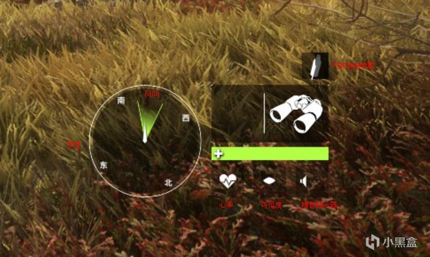最後就是氣味了,人物發出的氣味會被嗅覺靈敏的獵物捕捉到,但最爲關鍵的是氣味還會隨風傳播,界面右下角的羅盤除了指示方位外,還能實時顯示當前的風向。
