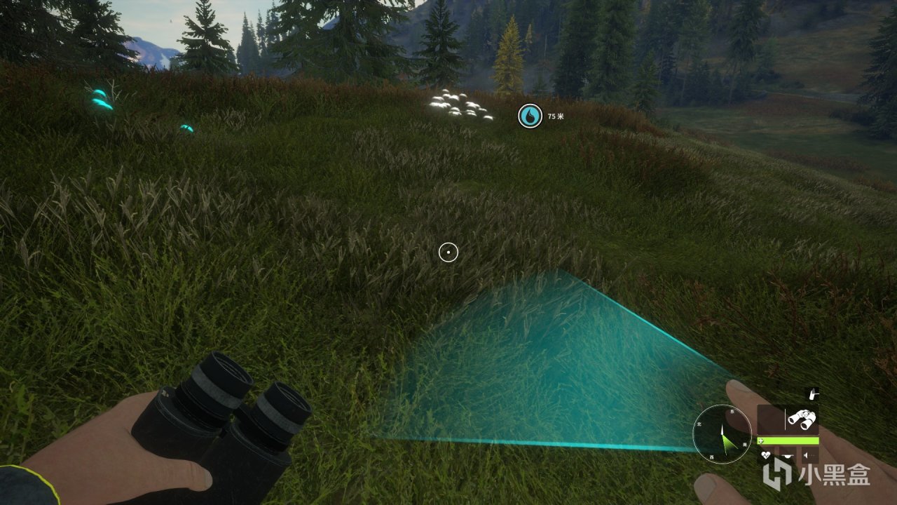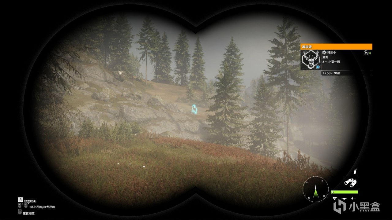 數字4爲望遠鏡,這是最最常用的工具之一,可以幫助玩家從很遠的地方標記獵物,當獵物出現在望遠鏡中心時按下E鍵便可標記,此時其身上會出現高亮輪廓,短時間內就算走到障礙物後面也能看清位置。