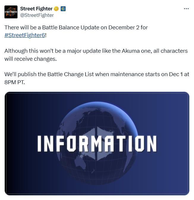 11月28日,卡普空宣布将于12月2日对《街头霸王6》进行平衡性调整更新,所有角色都有将进行改动,该更新预计将于北京时间12月2日中午12:00实施,具体改动将在维护开始后发布。