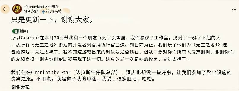 11月20日,Gearbox包办了Caleb及其朋友前往工作室的行程,Caleb得以试玩《无主之地4》目前的内容 ,他在Reddit上发文称这次体验太棒了,还感谢了所有支持和帮助他的人,称这是一次难以忘怀的经历。