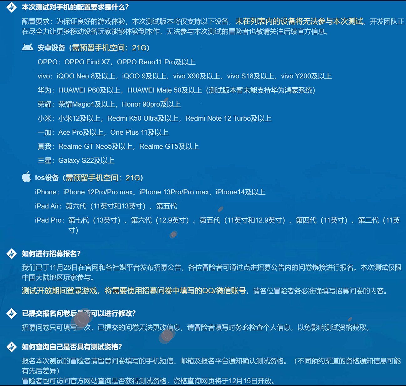 本次測試爲限量刪檔不計費,版本內容均爲開發中,不代表最終品質。對手機的配置需求較高,未滿足條件則無法參與。