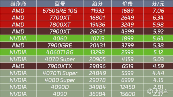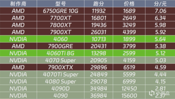 在這個價位 CPU不僅可以選擇AMD的5600,intel陣營的i5 12400F同樣也是值得考慮,對於剛開始瞭解電腦硬件的小白來說,i5 12400F這顆CPU算是怎麼選都不會選錯的一顆。用這顆CPU來搭配4060和4060Ti也是非常主流的配置了,這兩張顯卡的性價比天梯圖大家可以看一下,在N卡中是可以排到第一與第二的。