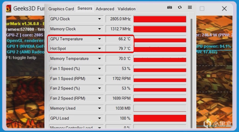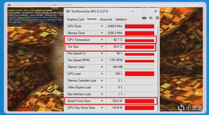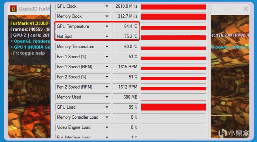 微星4060Ti魔龍在3D MARK TIME SPY中得分13775分,Port Royal得分8074分,經過甜甜圈10分鐘的滿載壓力測試,最終功耗是來到了161.8W,此時GPU的溫度爲55.6度,熱點溫度最終爲65.7度,看來微星對於散熱這方面的確是有一套的,2張魔龍的溫度控制是非常到位了。