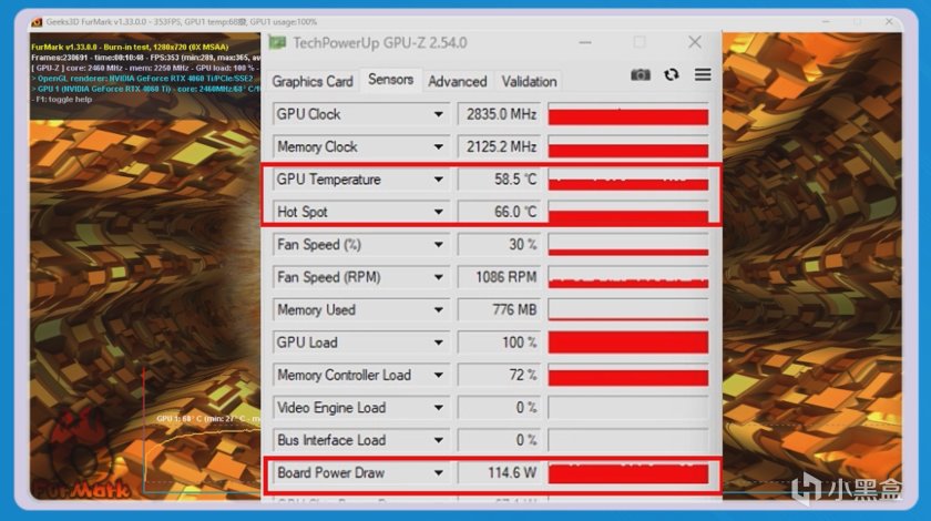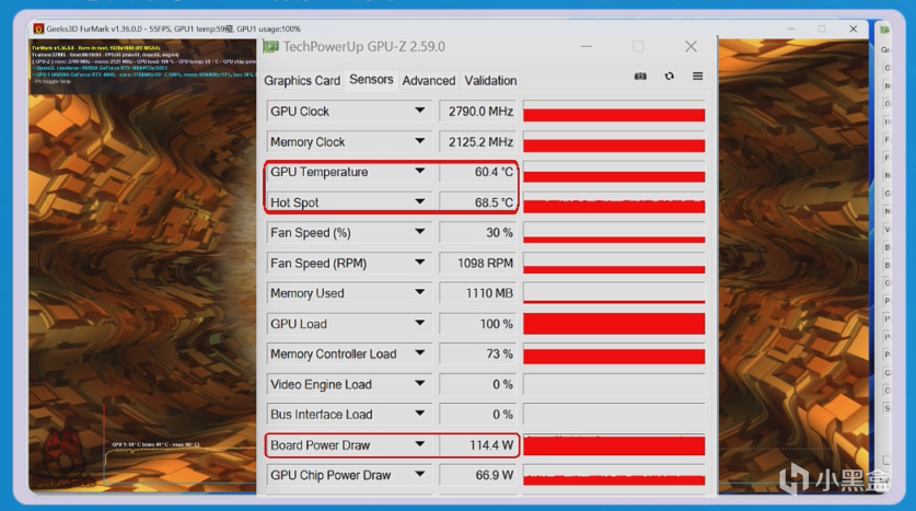 華碩4060雪豹在3D MARK TIME SPY 得分10385分,Port Royal得分6034分,在甜甜圈烤機10分鐘後,功耗爲114.4W時,GPU的核心溫度爲60.4度,熱點溫度爲68.5度,華碩畢竟也是N卡中的一線品牌,顯卡的做工用料以及售後服務確實不錯,對小白來說會有很好的體驗。