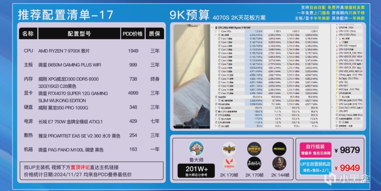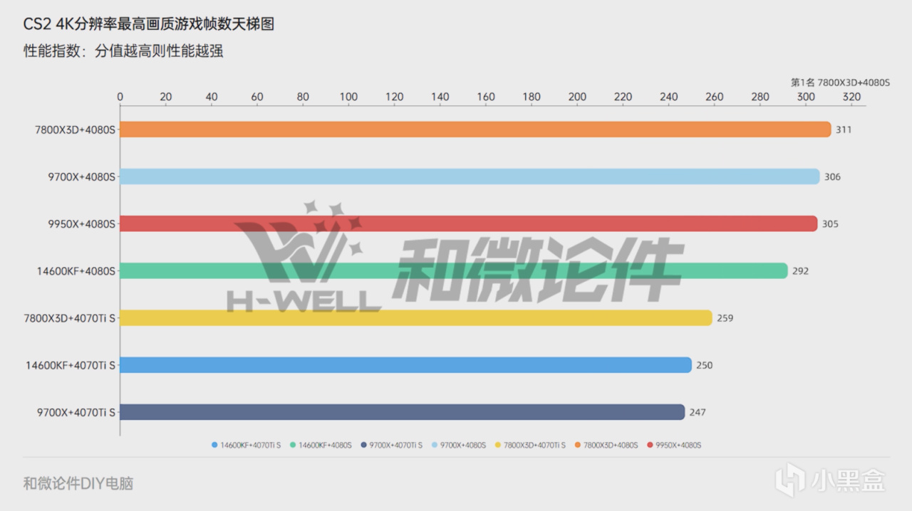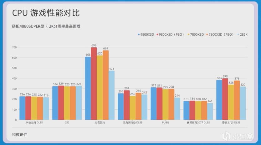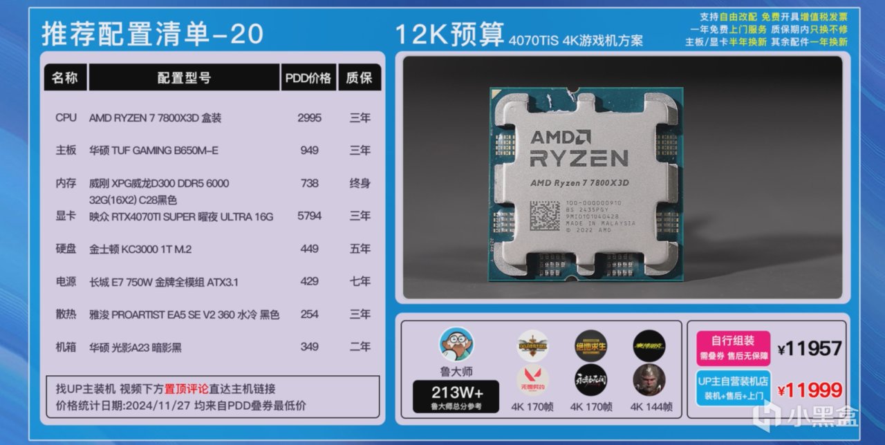 第一套方案是7800X3D搭配4070TI SUPER的黑色方案,選擇7800X3D一方面是9800X3D的溢價的確是太高了,另一方面是7800X3D依然是除9800X3D以外最強的遊戲CPU,在1080P分辨率下2顆CPU的確有一定的性能差距,經過我們的實測,2K分辨率兩顆CPU的差距之有4%,4K只會更低,搭配4070TI SUPER以及4080SUER玩4K分辨率的小夥伴應該會更多一些。